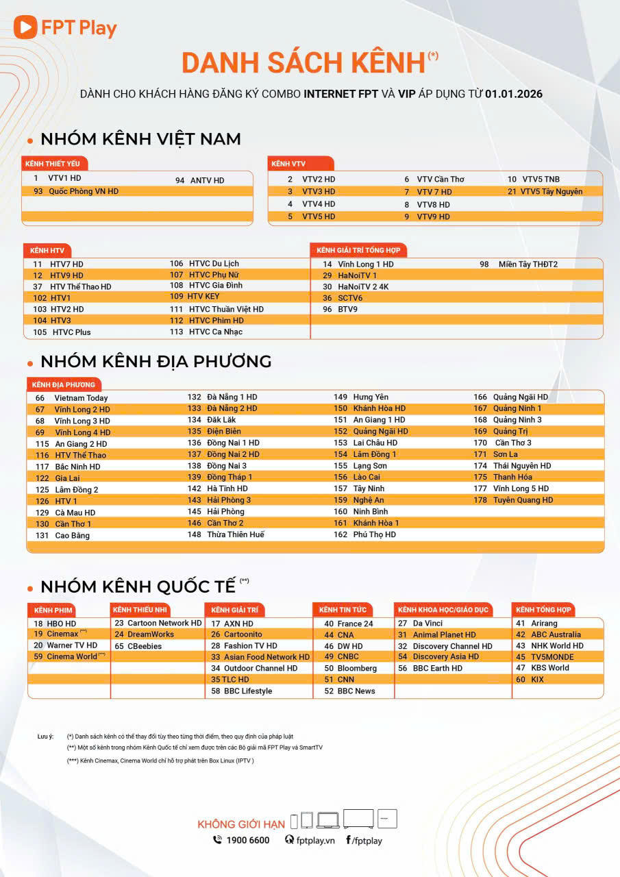 FPT Play trở thành lựa chọn hàng đầu trong thời đại số, phù hợp cho mọi gia đình, nhân viên văn phòng, người mê bóng đá, trẻ nhỏ và tất cả những ai mong muốn tận hưởng kho giải trí phong phú, chất lượng và tiện lợi chỉ trong một ứng dụng. Gần 170 kênh truyền hình trong nước và quốc tế như: VTV, HTV, HTVC, VTC, THVL, HBO, Cinemax, AXN, BBC, NHK, Discovery Asia,…Xem danh sách kênh đầy đủ Tại đây.